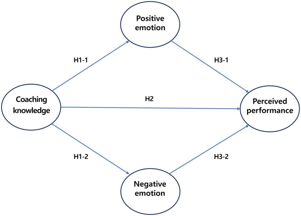 Results: Coaching knowledge significantly increased positive emotion (β = 0.554, p < 0.001) and perceived performance (β = 0.333, p < 0.001), and significantly decreased negative emotion (β = −0.356, p < 0.001). Positive emotion significantly increased perceived performance (β = 0.638, p < 0.001), whereas negative emotion did not decrease perceived performance (β = −0.029, p = 0.427).