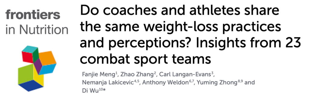 Meng F, Zhang Z, Langan-Evans C, Lakicevic N, Weldon A, Zhong Y, Wu D. Do coaches and athletes share the same weight-loss practices and perceptions? Insights from 23 combat sport teams. Front Nutr. 2026 Mar 18;13:1802696.