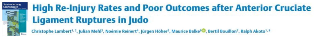 Lambert C, Mehl J, Reinert N, Höher J, Balke M, Bouillon B, Akoto R. High Re-Injury Rates and Poor Outcomes after Anterior Cruciate Ligament Ruptures in Judo. Sportverletz Sportschaden. 2026 Mar;40(1):25-31.