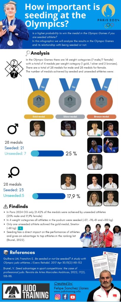 Guilheiro and Franchini (2017) (1) found that athletes seeded had a chance of 25.0% to 50.0% for males and between 12.5% to 50.0% for females to win an Olympic medal, resulting in an over- all probability of around 41.1% when all groups are considered.