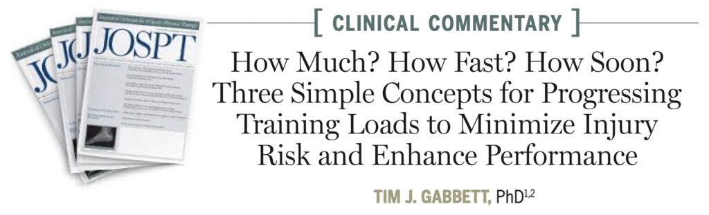 Gabbett TJ. How Much? How Fast? How Soon? Three Simple Concepts for Progressing Training Loads to Minimize Injury Risk and Enhance Performance. J Orthop Sports Phys Ther. 2020 Oct;50(10):570-573.
