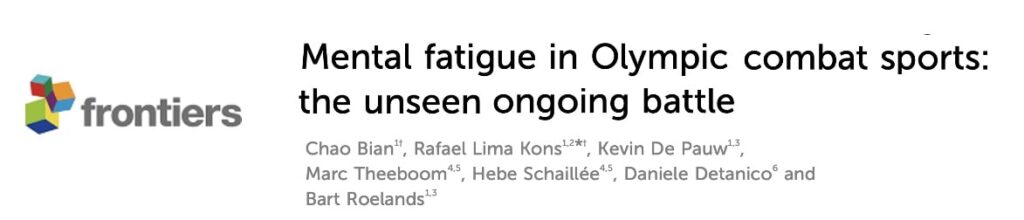 Bian C, Kons RL, De Pauw K, Theeboom M, Schaillée H, Detanico D, Roelands B. Mental fatigue in Olympic combat sports: the unseen ongoing battle. Front Sports Act Living. 2025 Nov 13;7:1697860. doi: 10.3389/fspor.2025.1697860.